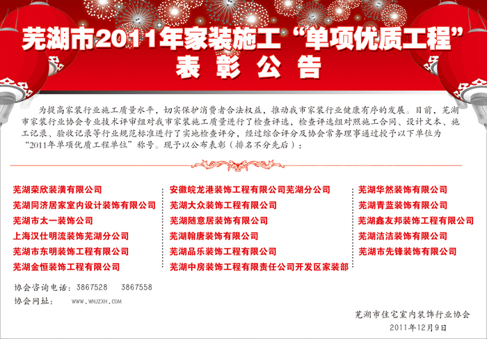 芜湖市2011年家装施工“单项优质工程”表彰公告